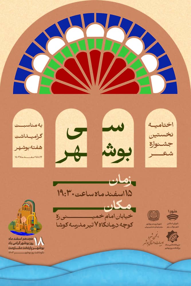آیین پایانی جشنوارهٔ شعر « سی بوشهر » روز چهارشنبه ، پانزدهم اسفندماه ۱۴۰۳ ، با حضور جمعی از مسئولان ، اعضای شورای شهر، چهره های ادبی استان ، شاعران و دوست داران ادب فارسی در سالن اجتماعات مدرسهٔ کوشا شهر بوشهر برگزار شد.