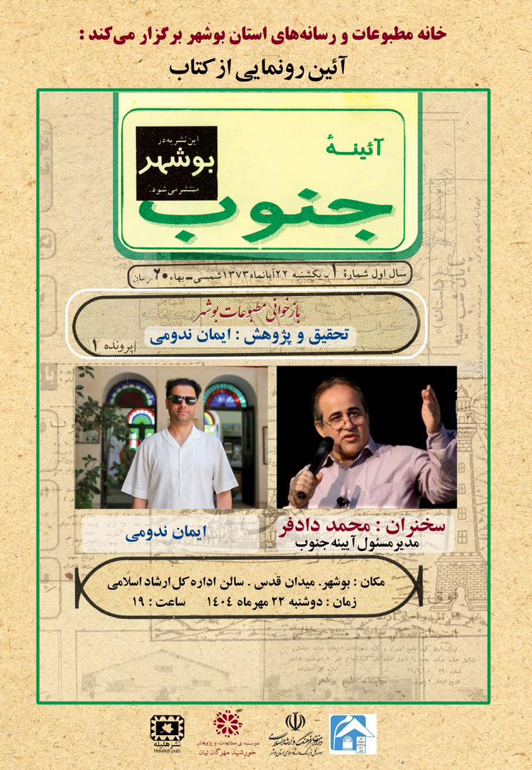 جلد نخست مجموعه پژوهشی «بازخوانی مطبوعات بوشهر پس از سال 1357» به قلم ایمان ندومی، روزنامهنگار بوشهری، با عنوان آیینه جنوب منتشر شد.