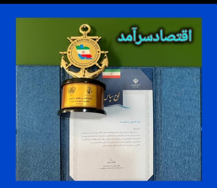 دریا و صنعت دریانوردی یکی از ارکان مهم اقتصاد، امنیت و اقتدار ملی ماست. در روز جهانی دریانوردی به پاس خدمات و تلاشهای ارزنده جنابعالی در رشد و توسعه دریانوردی جمهوری اسلامی ایران و تحقق عینی حضور فعال و افتخارآفرین در پهنه آبهای منطقهای و بینالمللی با اهدای این لوح، از جنابعالی به عنوان «رسانه دریایی نمونه» تقدیر و تشکر به عمل میآید.