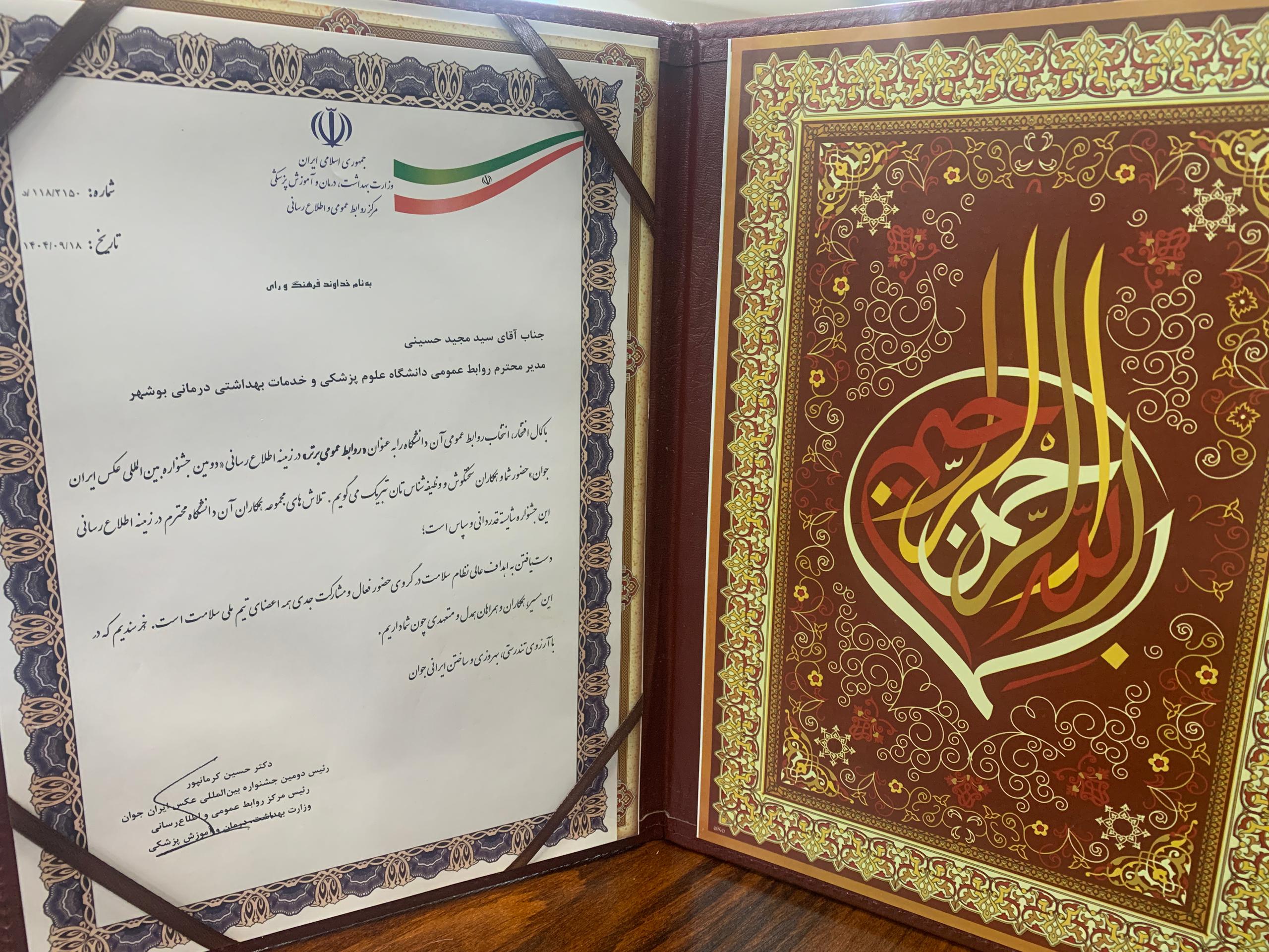 روابط عمومی دانشگاه علوم پزشکی بوشهر در دومین جشنواره بینالمللی عکس ایران جوان درخشید