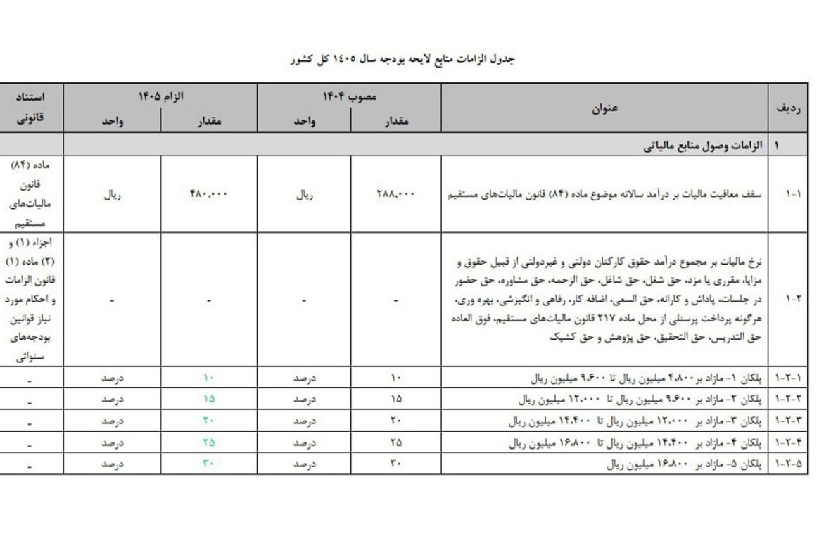 در لایحه بودجه سال ۱۴۰۵ سقف معافیت مالیات بر درآمد سالانه افراد چهارصد و هشتاد میلیون تومان پیشنهاد شده است که ۶۶٫۶ درصد نسبت به سال ۱۴۰۴ افزایش نشان میدهد.